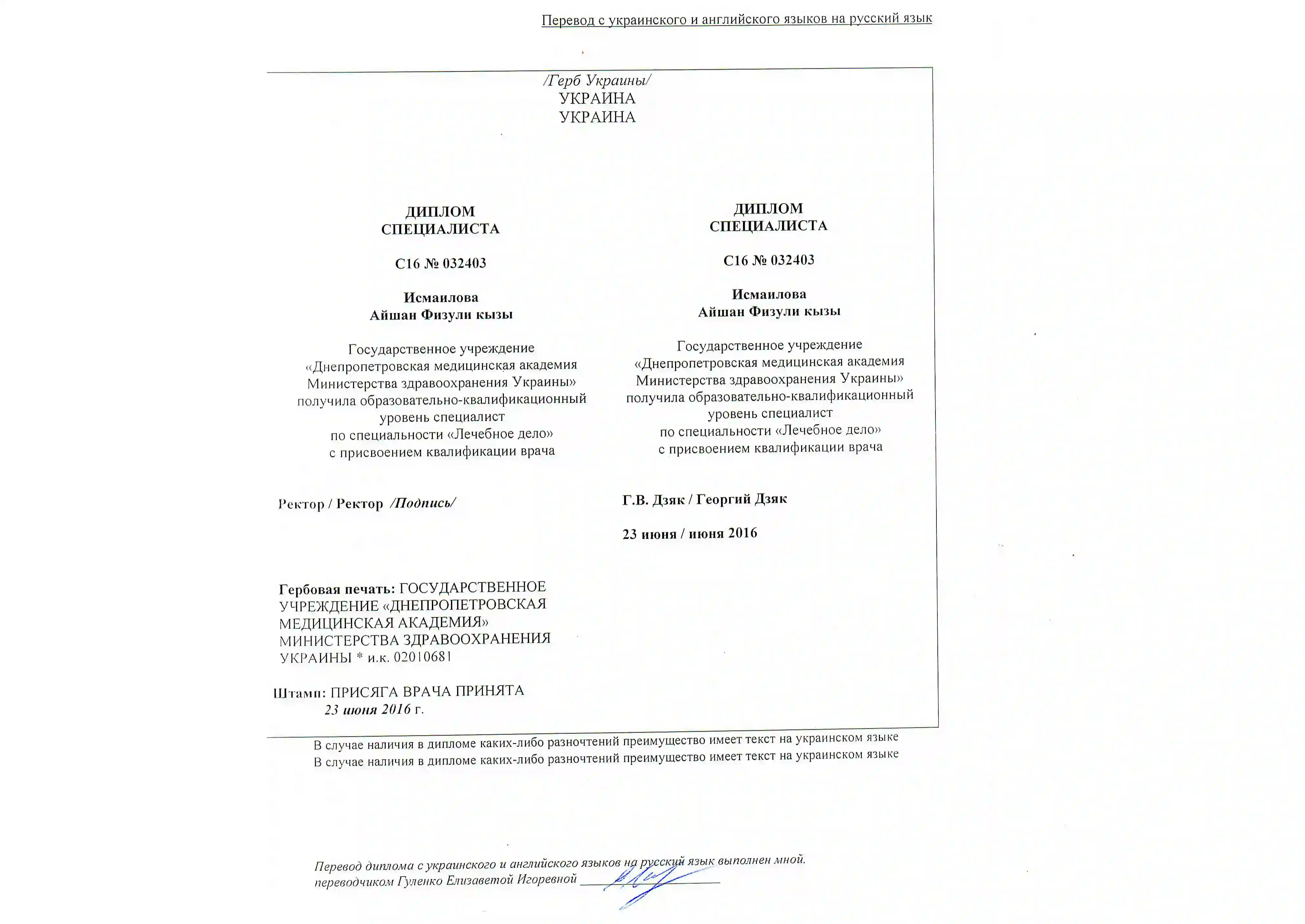 2016 — Днепропетровская медицинская академия Министестраства здравоохранения Украины (Врач по специальности «Лечебное дело»)